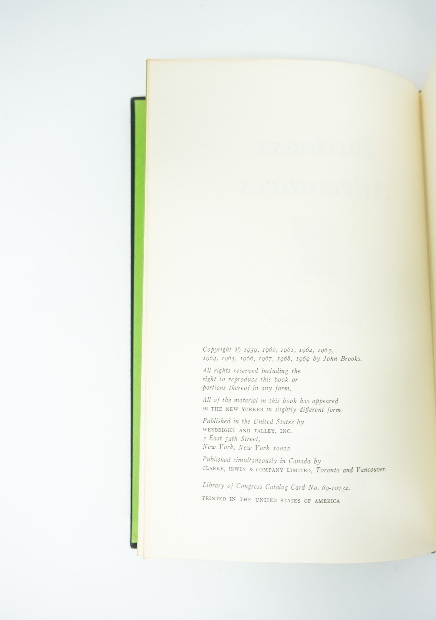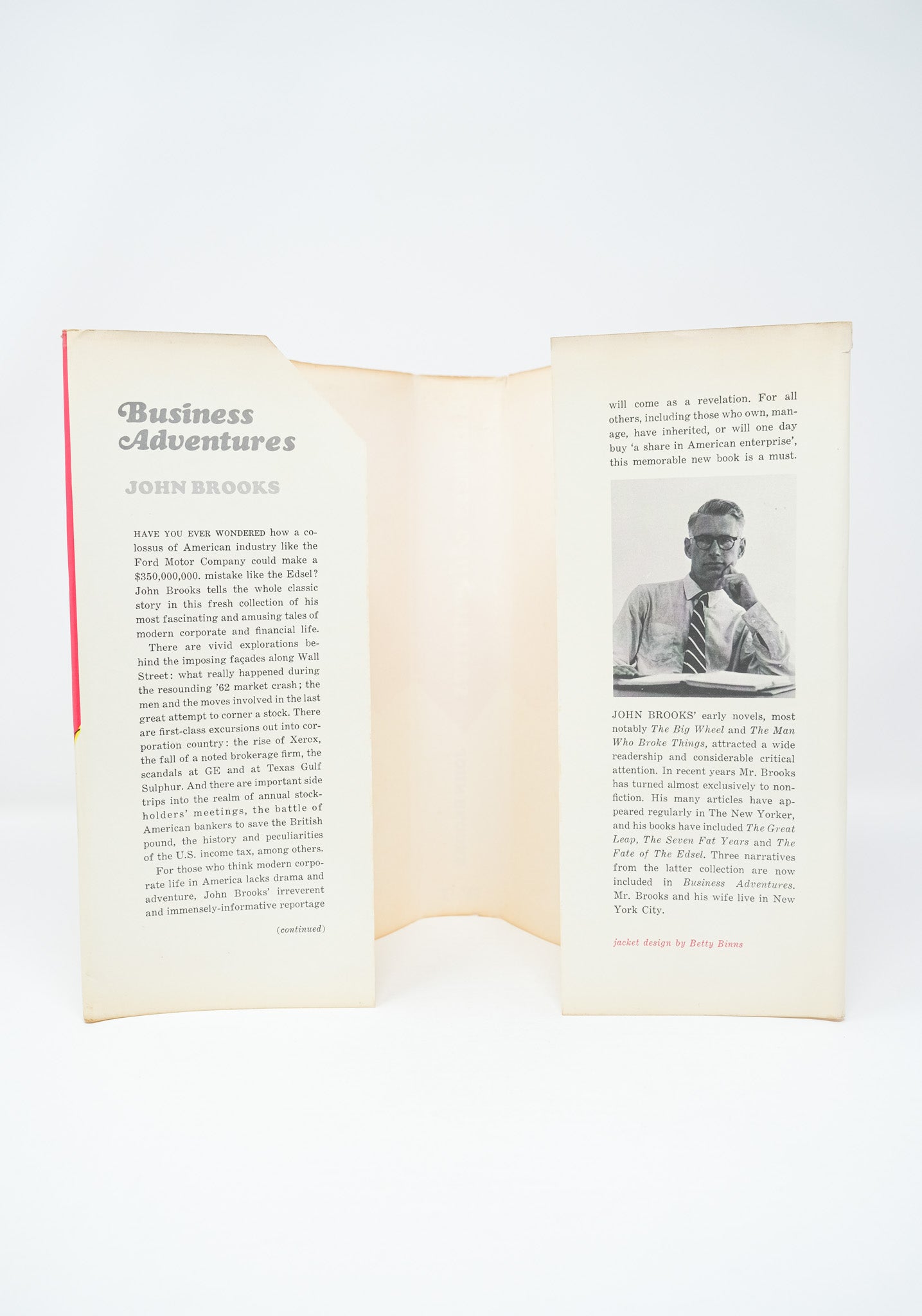 First edition. First printing, with no subsequent printings mentioned on the copyright page. A very good copy in a very good, price clipped dust jacket. Some toning to the spine. A little foxing to the outer text block edges but the contents fine. A moderate lean to the spine - the binding firm but askew. Some edgewear and very small closed tears to the dust jacket but a very nice example overall. A classic in its genre, Business Adventures brilliantly chronicles dramatic moments in corporate and financial history, offering valuable insights into human nature and decision making. To this day it is endorsed as a source of wisdom by leading figures in business and finance. Scarce in the true first edition.