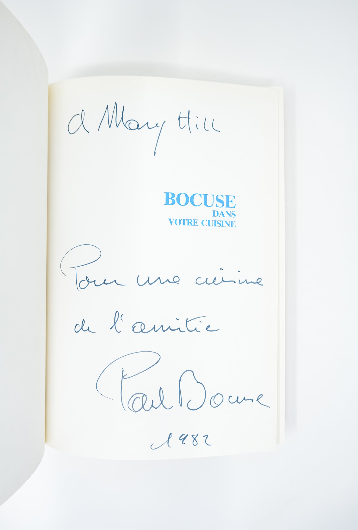 First edition. Presentation copy, inscribed on the half title page: “A Mary Hill / Pour une cuisine de l’amitie / Paul Bocuse / 1982.” Slight bumping and edge wear to the covers. A little blemish to the top edge of the outer text block, not affecting the contents. A very good to near fine copy overall. Paul Bocuse was one of the pioneers of Nouvelle cuisine, and among the most celebrated and influential figures in French gastronomy. A remarkable example, very scarce inscribed.