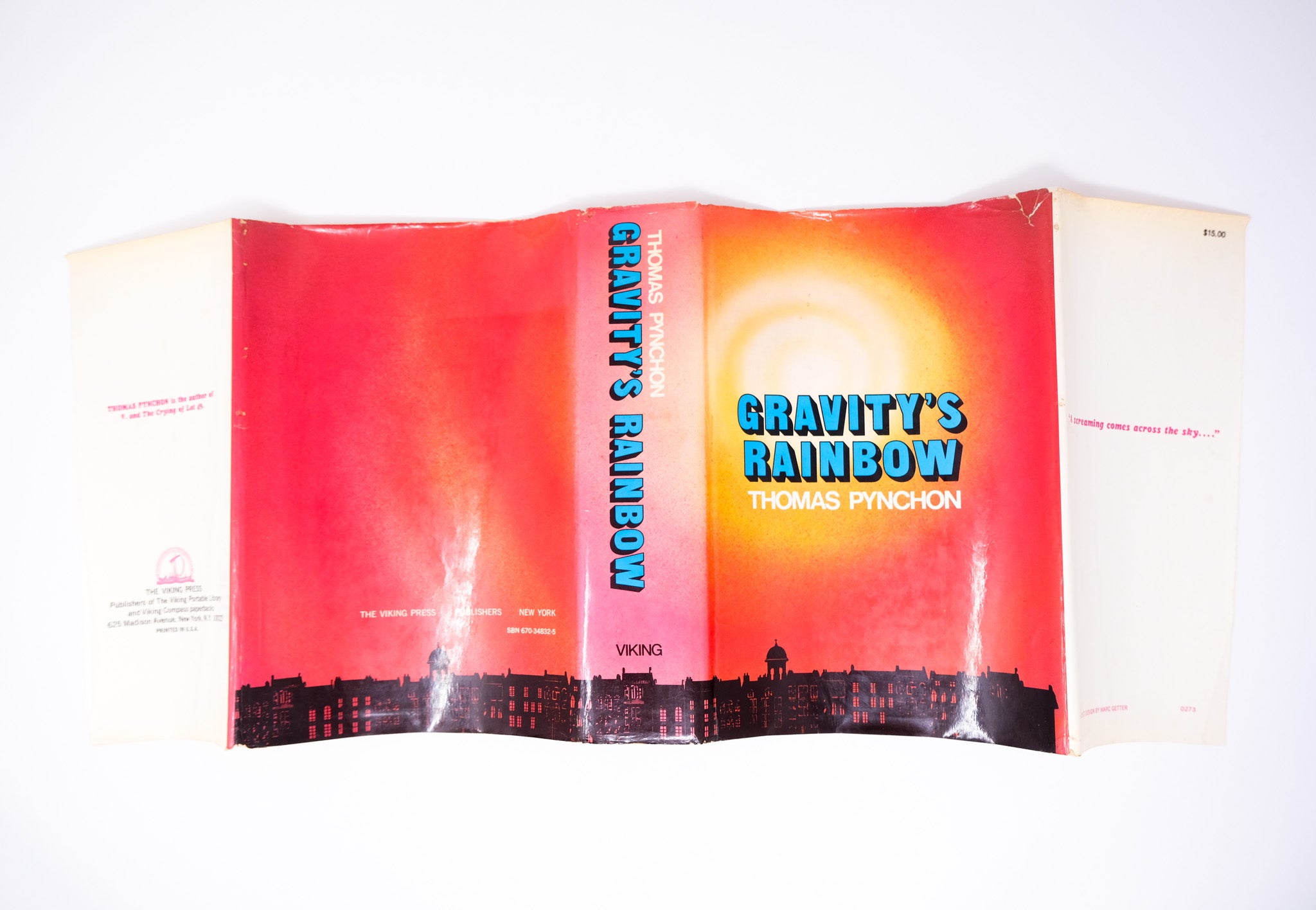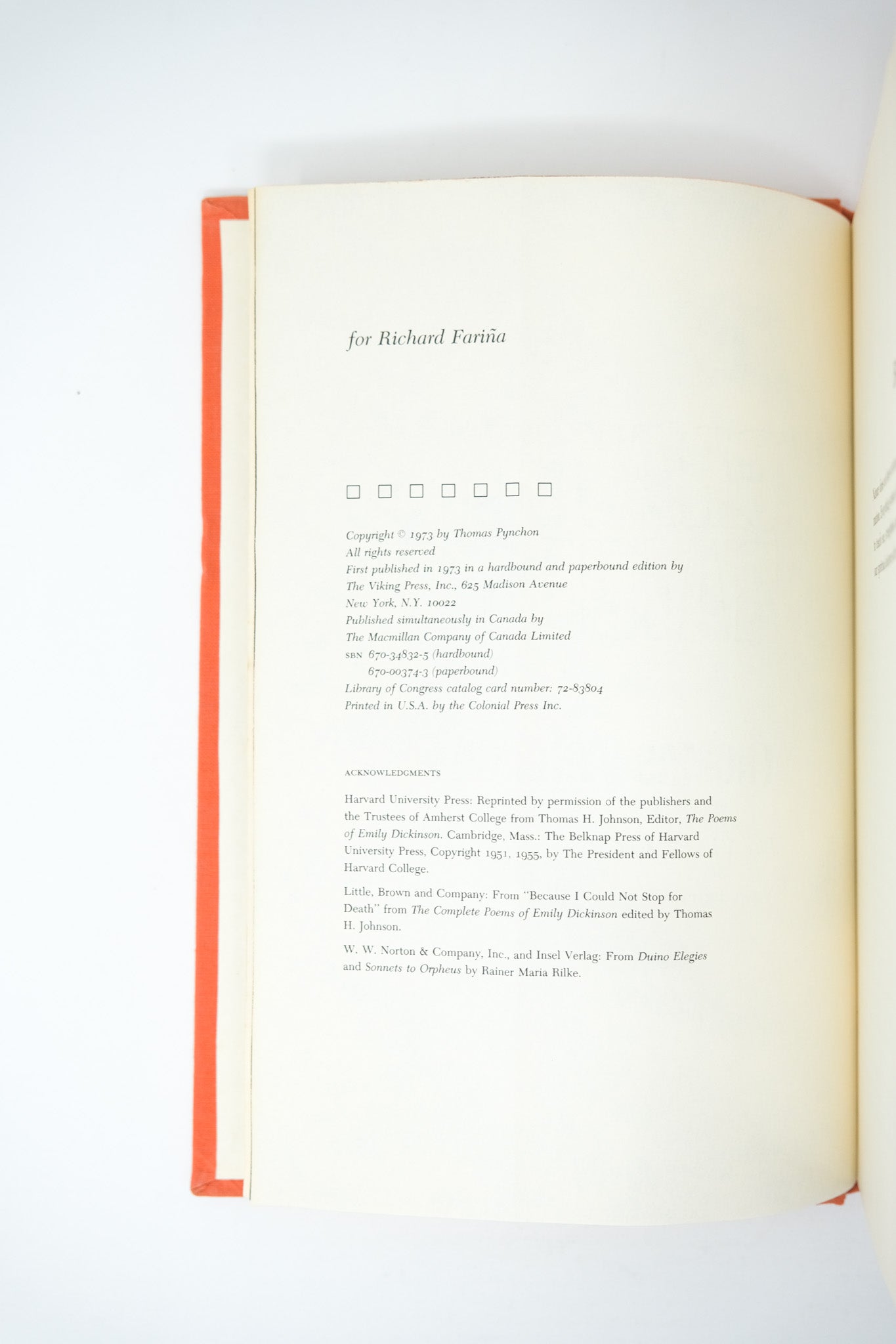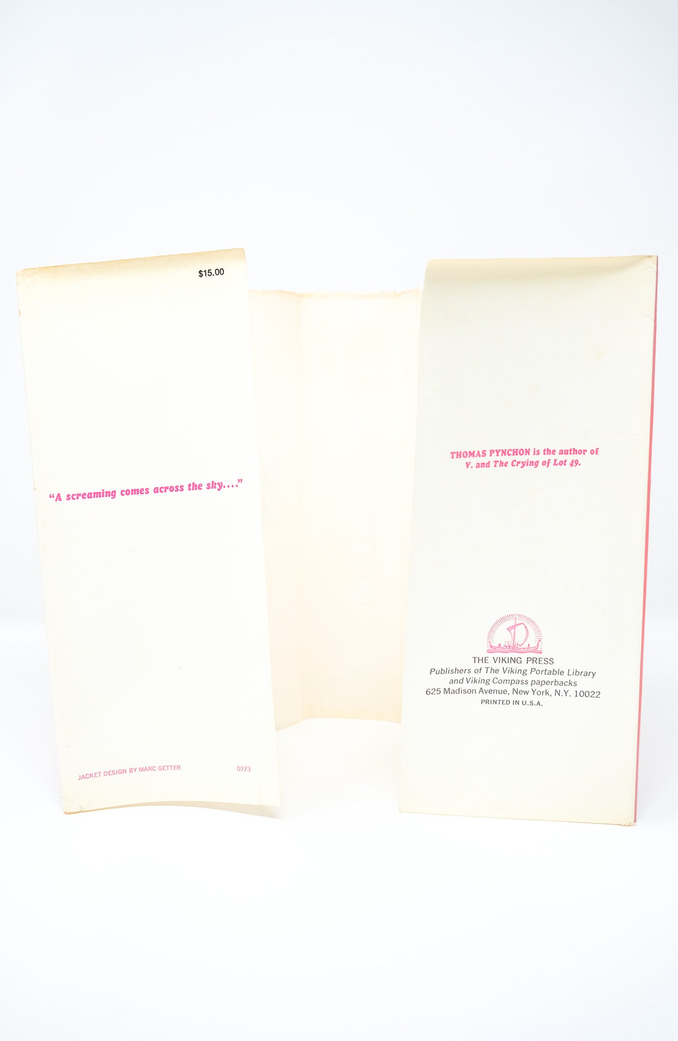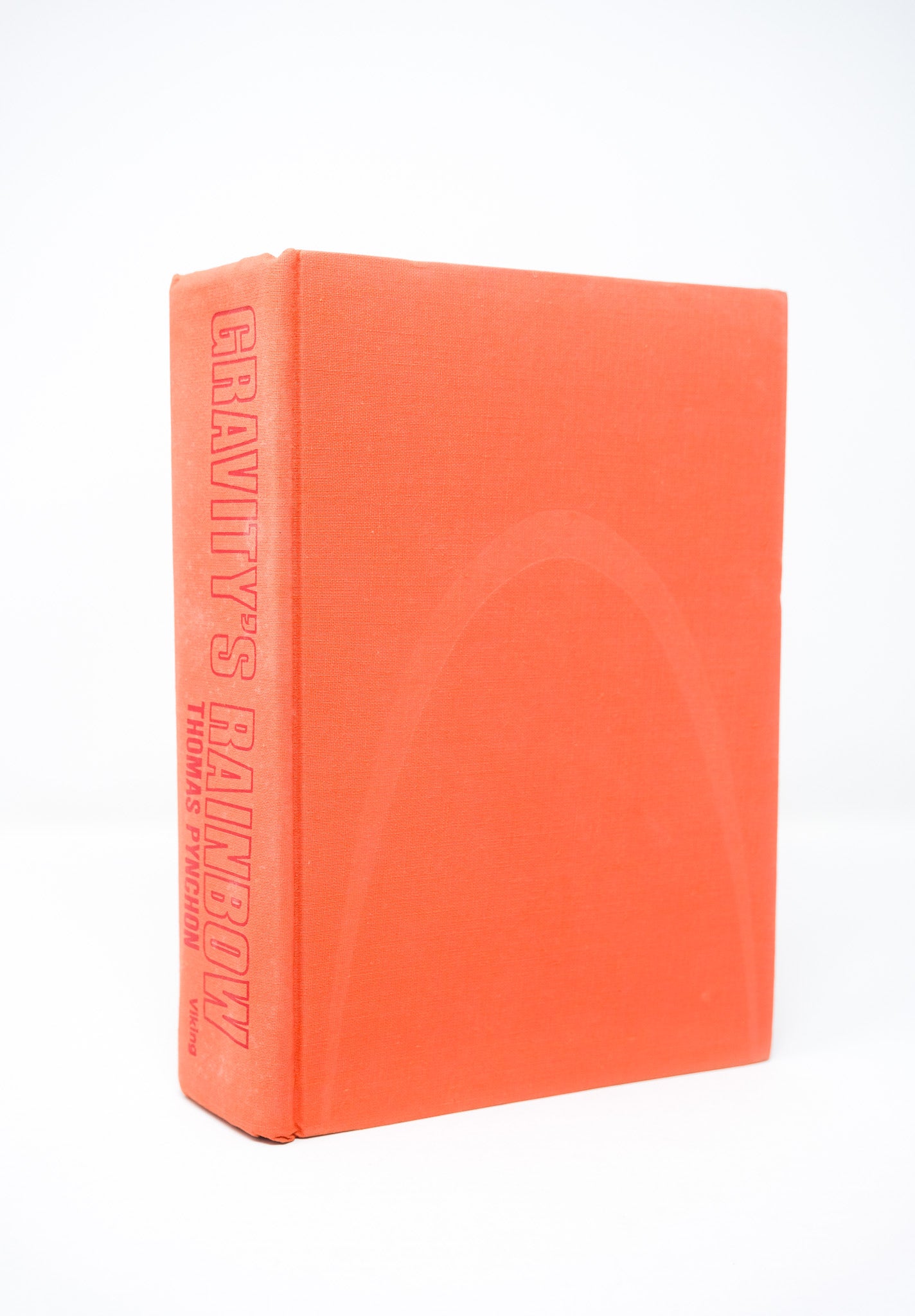 First edition. First printing. A sound, very good copy. Slight wear to the cloth.  A previous owner’s bookplate to the front pastedown. Some foxing to the pastedowns and endpapers. The orange topstain a bit faded. A vertical crease on the half title page, extending with decreasing visibility to subsequent pages until pp. 30. A little mark to the fore-edge of the outer text block, but the contents fine. In a very good, unclipped dust jacket, with hardly any of the usual toning to the spine. Slight edgewear and a small closed tear at the top right corner of the front panel, with a discrete tape reinforcement at the verso. A very nice example in the bright dust jacket. Pynchon’s masterpiece, lauded as one of the greatest American novels.