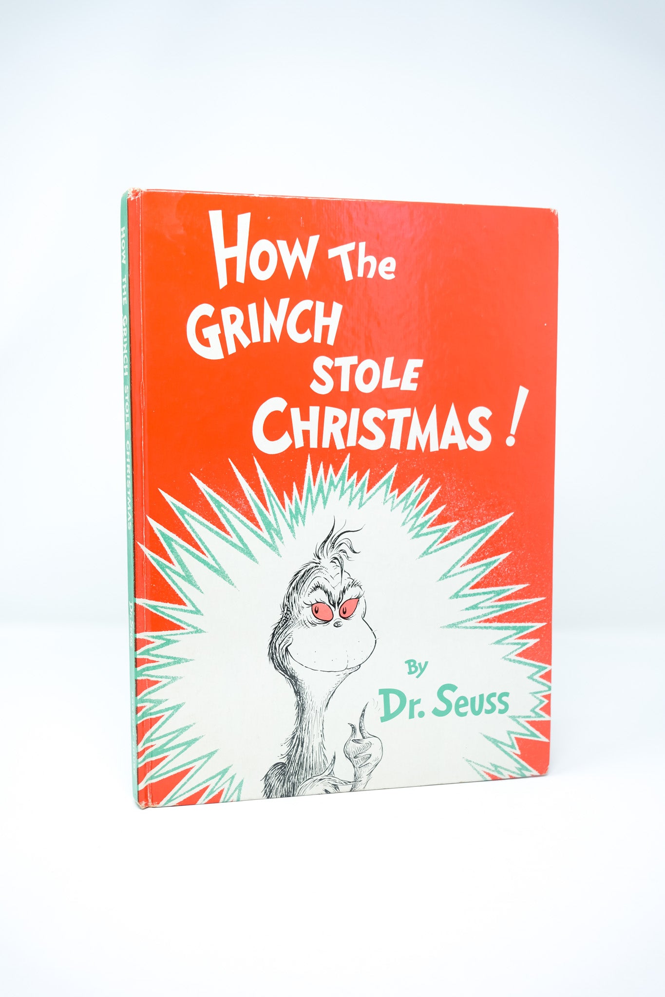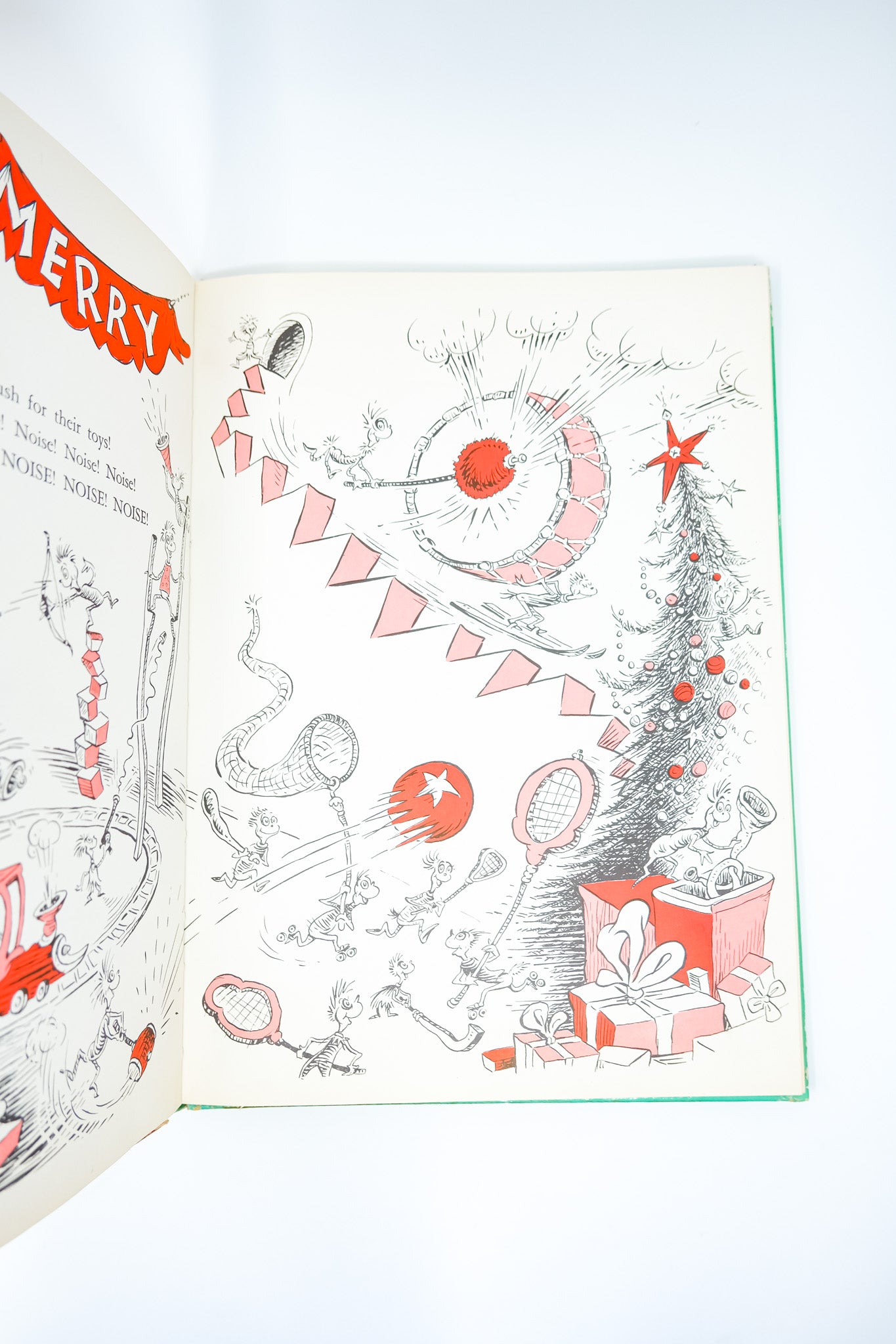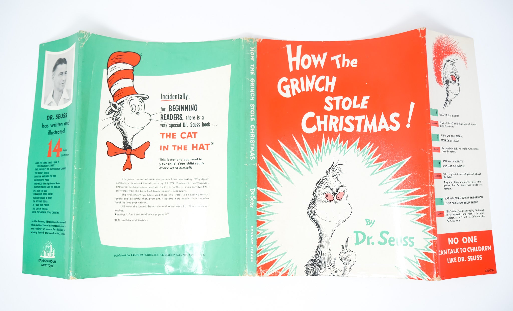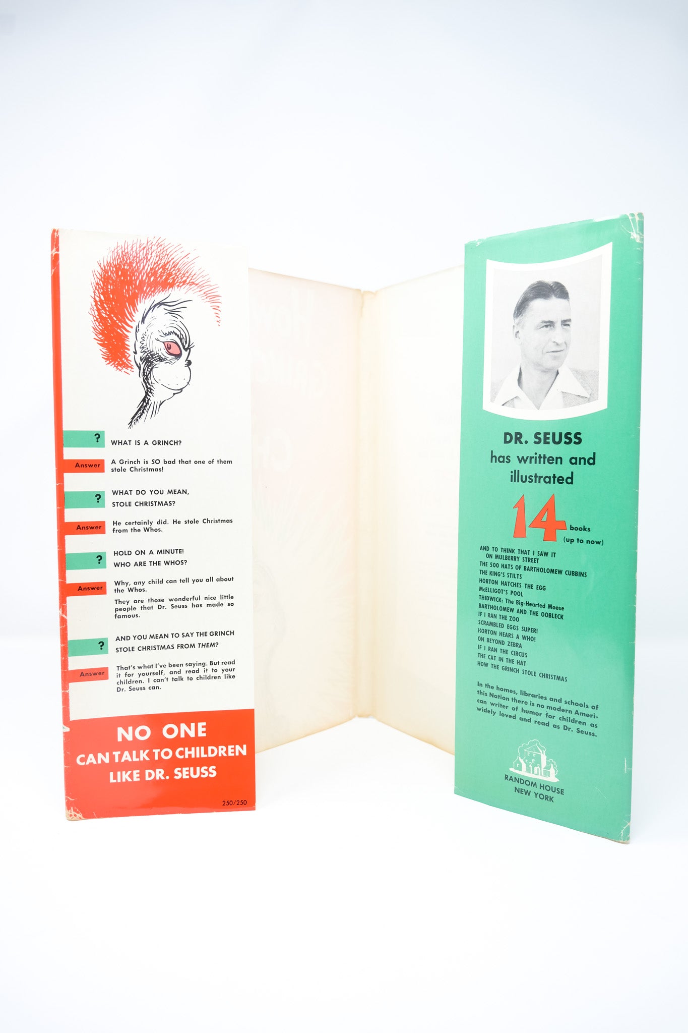 First edition. First issue, with the points present: “The Cat in the Hat” on the back board, 13 books listed on the final textual page, 14 titles (up to now) on the rear flap of the dust jacket, and 250/250 unclipped on the front flap. A near fine copy, the boards slightly edge worn. A Christmas inscription (only in pencil) on the first free endpaper, but the contents flawless throughout. The jacket very good with some creasing and edge wear, and half inch closed tears at the head and foot of the spine. Still, an uncommonly crisp example overall of Dr. Seuss’s timeless Christmas story, which would define the holiday spirit for generations of young readers.