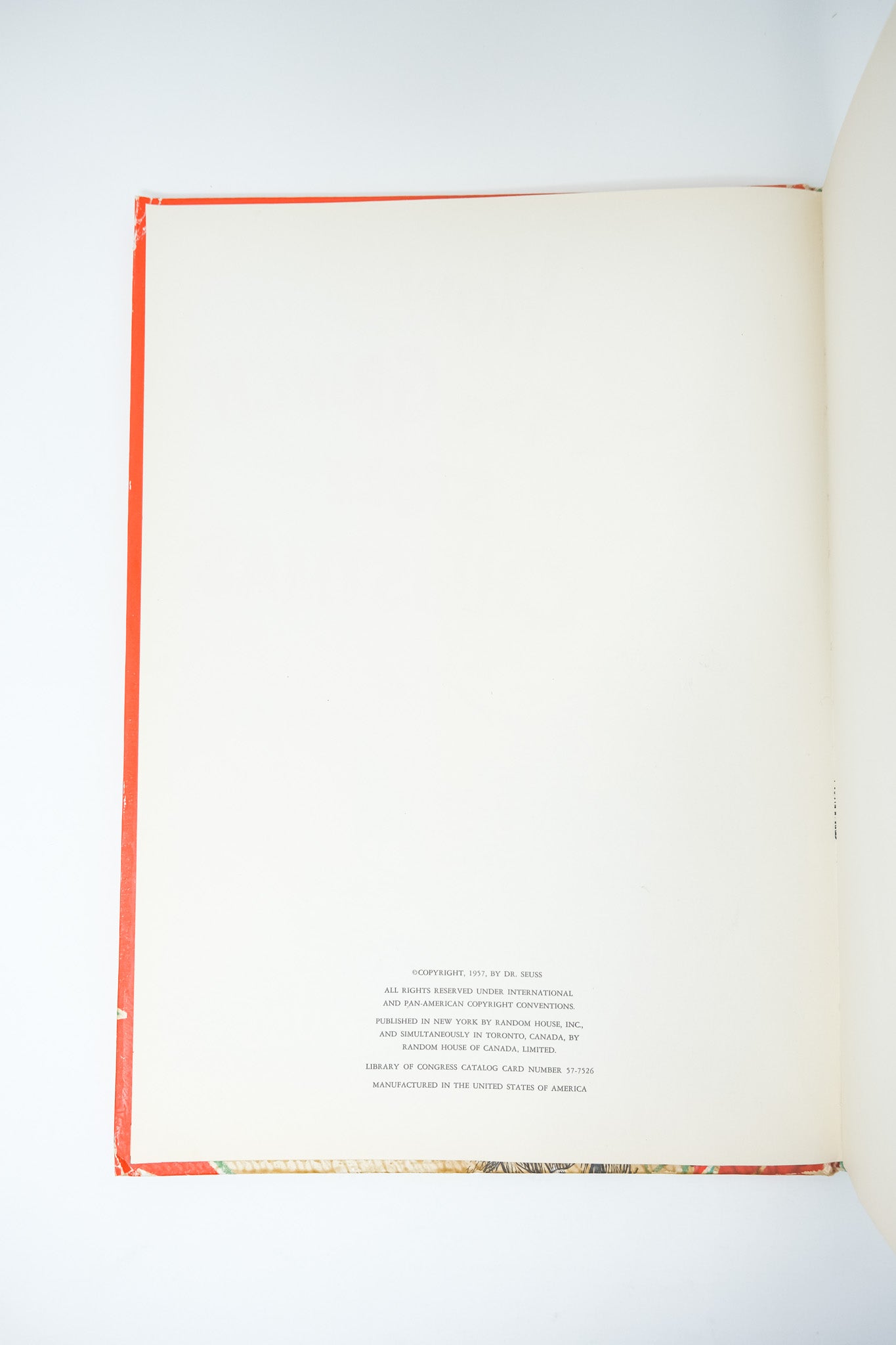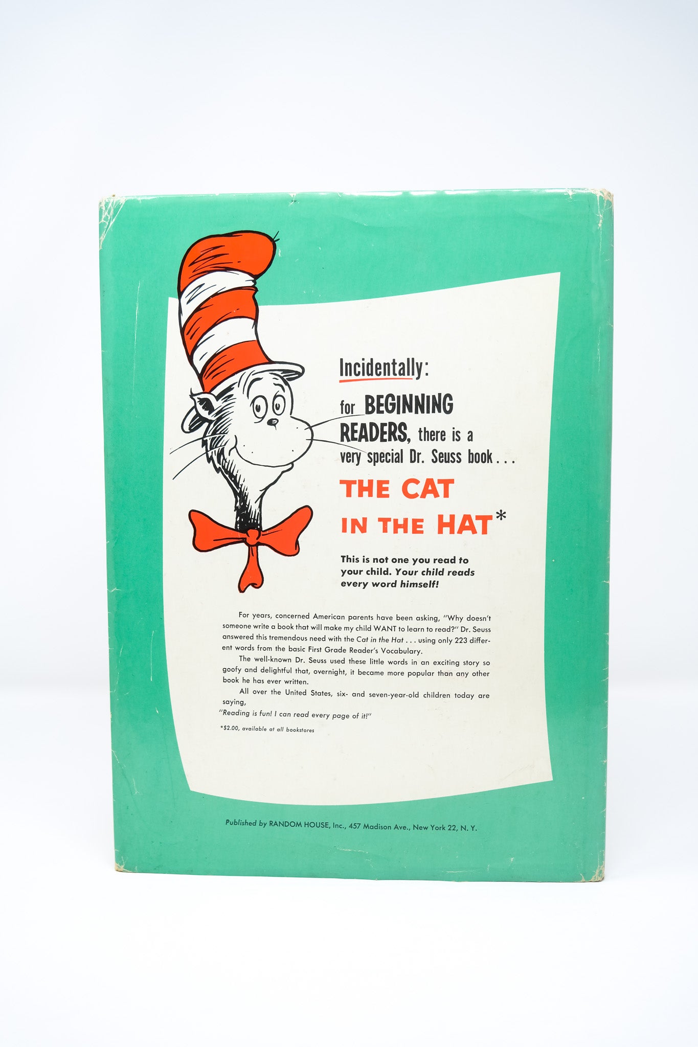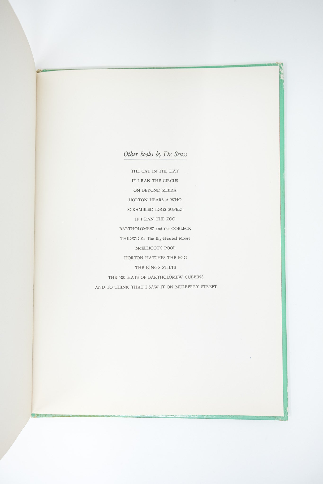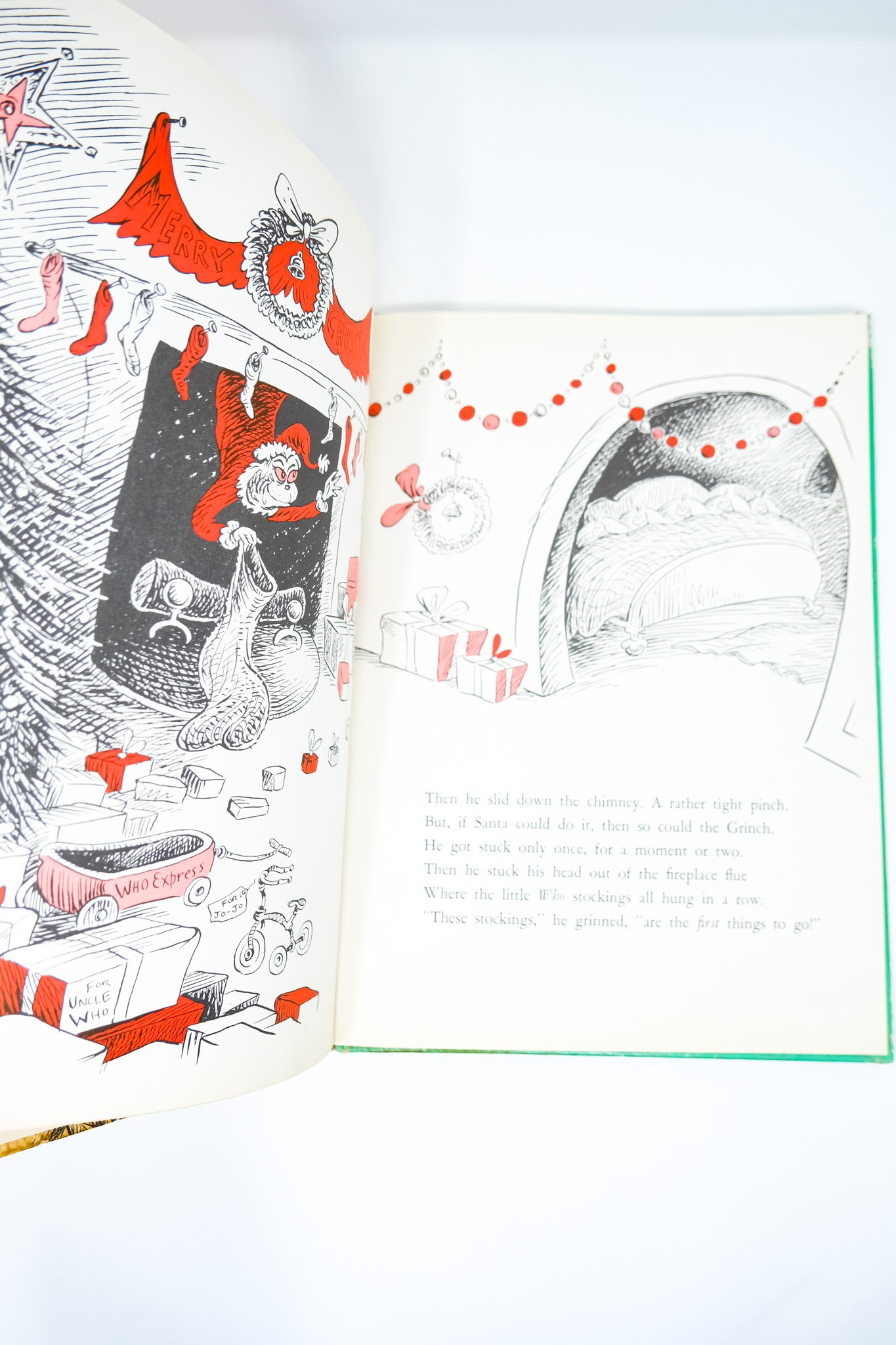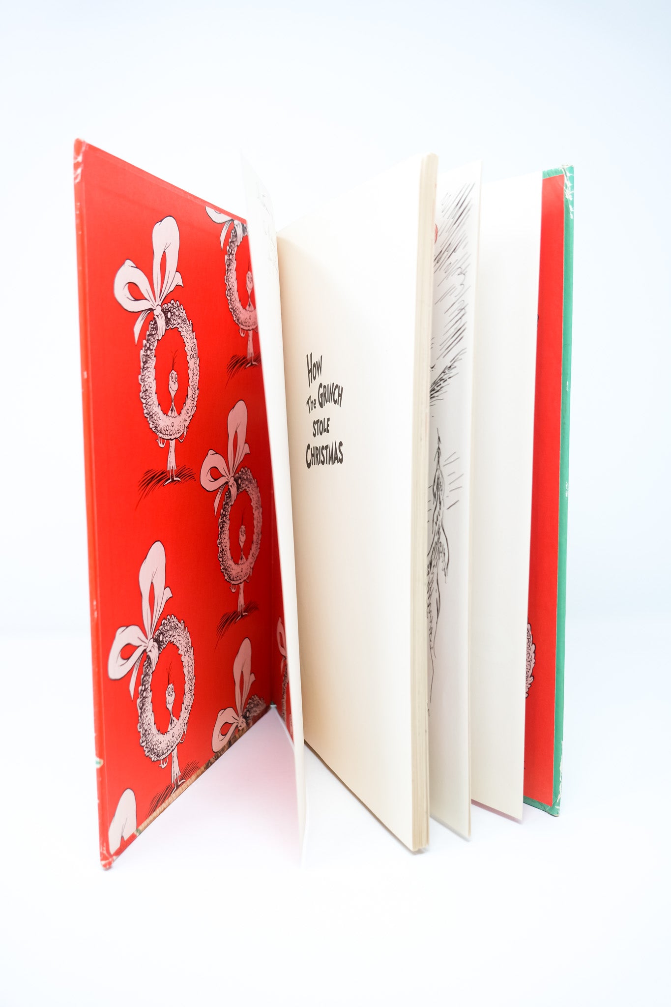 First edition. First issue, with the points present: “The Cat in the Hat” on the back board, 13 books listed on the final textual page, 14 titles (up to now) on the rear flap of the dust jacket, and 250/250 unclipped on the front flap. A near fine copy, the boards slightly edge worn. A Christmas inscription (only in pencil) on the first free endpaper, but the contents flawless throughout. The jacket very good with some creasing and edge wear, and half inch closed tears at the head and foot of the spine. Still, an uncommonly crisp example overall of Dr. Seuss’s timeless Christmas story, which would define the holiday spirit for generations of young readers.